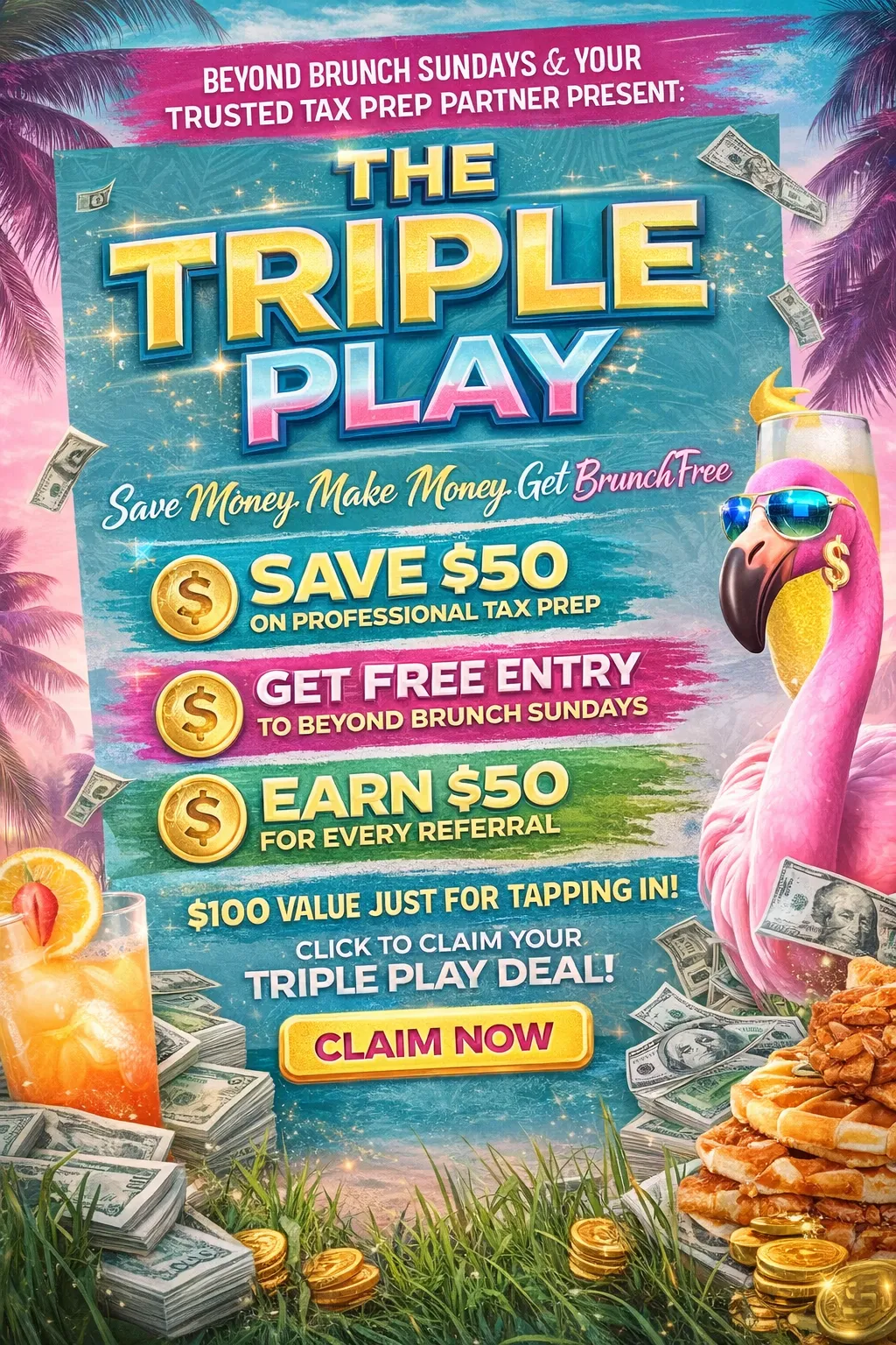 🥂 THE REWARD: Once your tax filing is completed and paid for, you’ll receive a FREE Entry Pass to Beyond Brunch Sundays ($50 value).